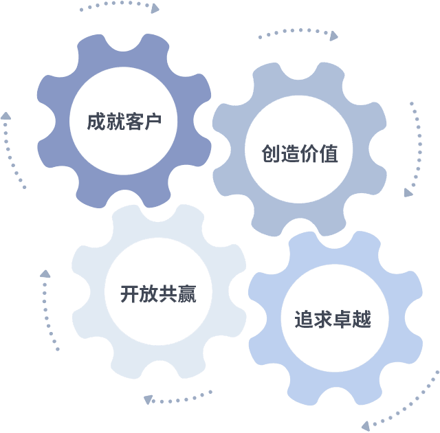 成就客户是一切决策的出发点,,,,创造价值是衡量所有工作的标准,,,,追求卓越是我们做事做人的态度,,,开放共赢是我们的格局也是最终的结果。。。价值观的齿轮环环相扣,,,,推动着组织里的每个人不断向前。。。。