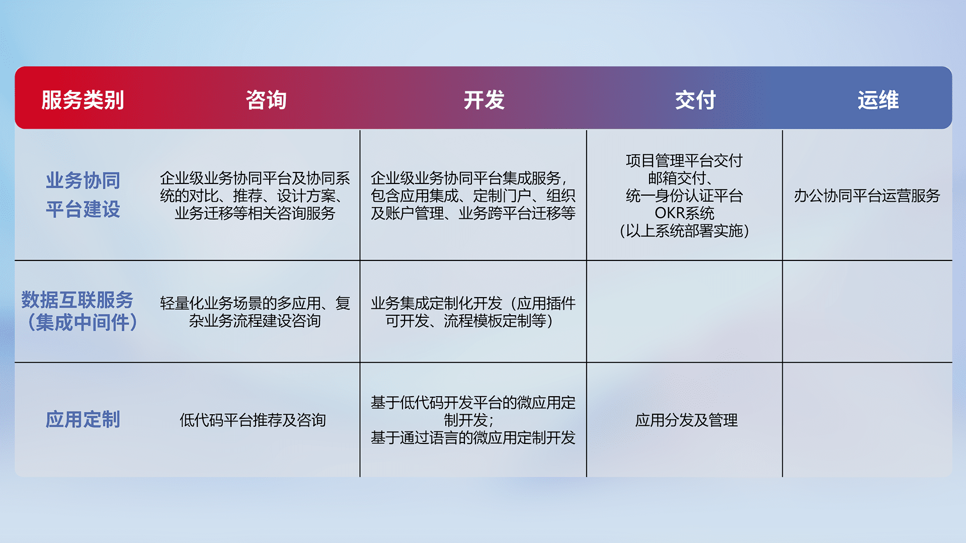 针对钉钉、、、、企微、、、、IDaas等平台级产品提供产品的规划、、、、方案、、交付、、定制化开发等服务,,,实现如统一协同办公、、、、智能客户服务、、混合会议管理、、智能数据查询、、等业务场景,,实现数字化转型。。
